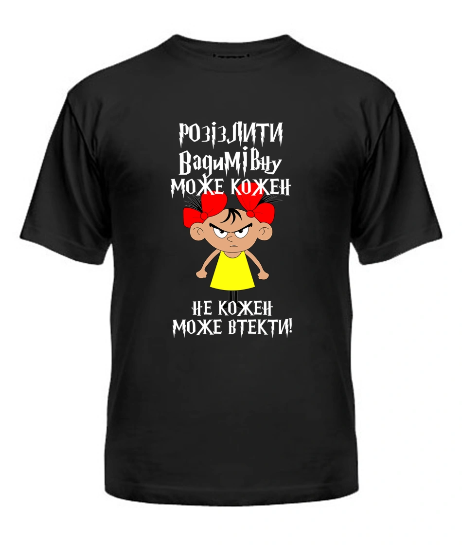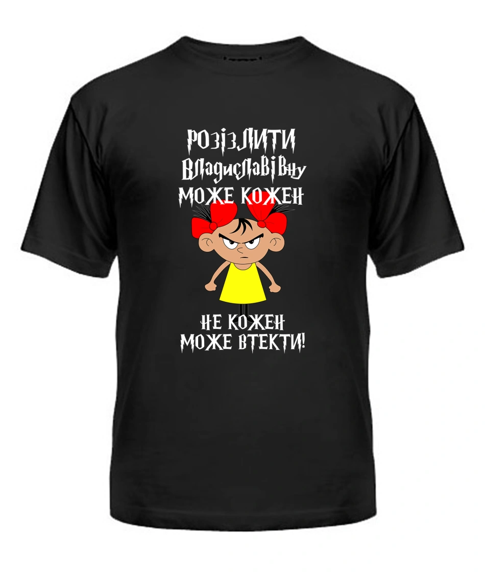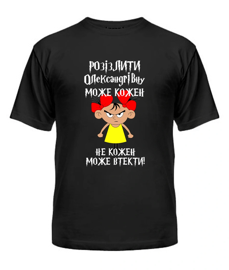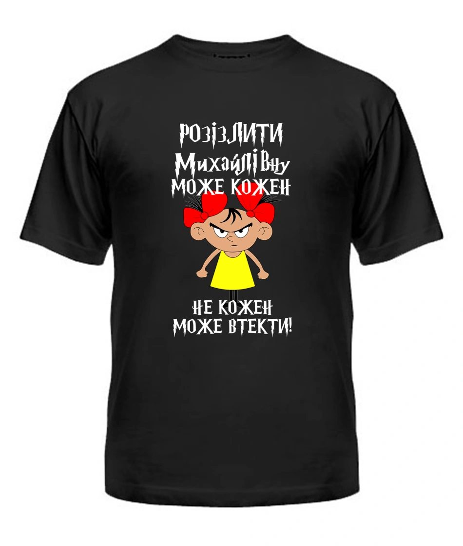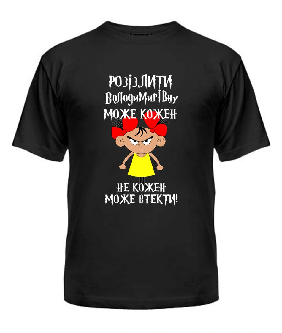 Футболка універсального крою для жінок (чорна) Розізлити може кожен [обери по батькові]