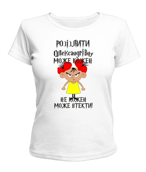 Жіноча футболка (біла) Розізлити може кожен [обери по батькові]
