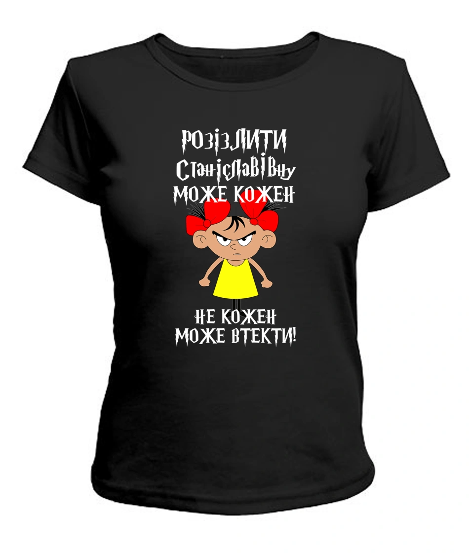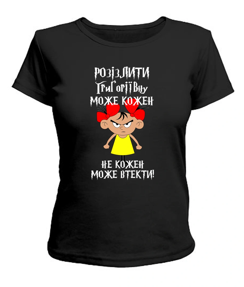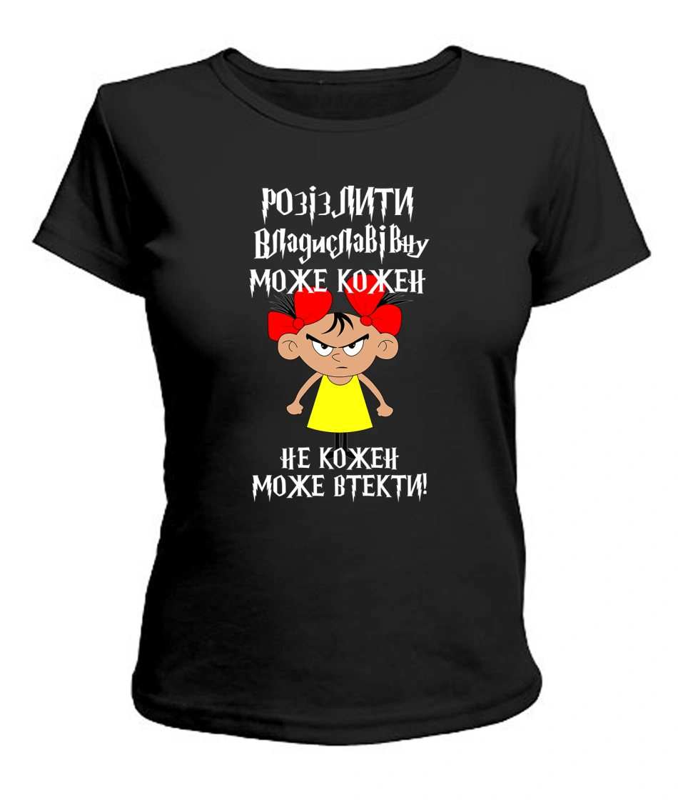 Жіноча футболка (чорна) Розізлити може кожен [обери по батькові]