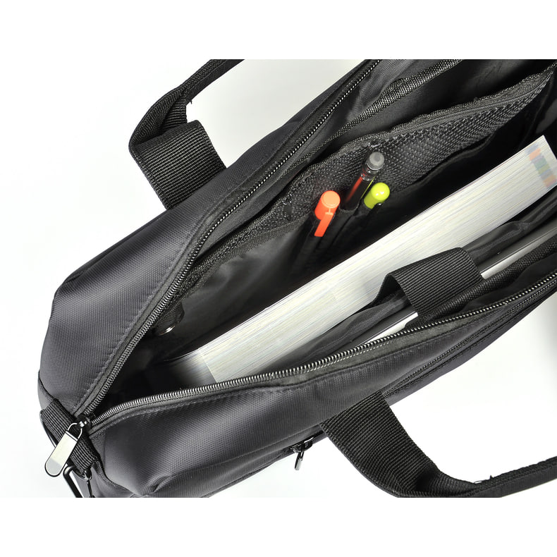Имеет одно основное большое отделение для ноутбука с мягким уплотнителем, один внутренний карман на молнии и два внешних кармана на молнии.